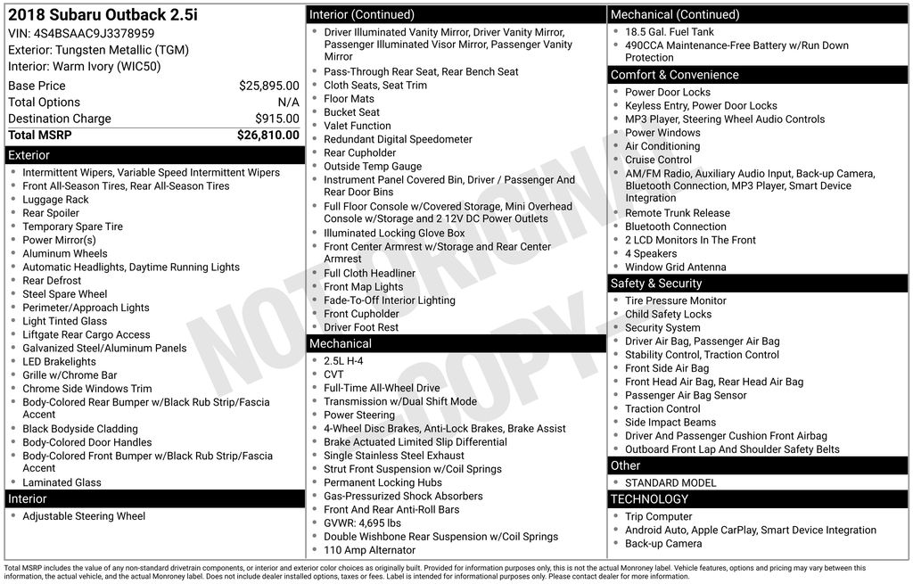 Whether you're tackling the daily commute or embarking on a weekend getaway, the 2018 Subaru Outback 2.5i is the perfect companion. Experience the perfect balance of capability, technology, and style â" visit our showroom today and let us help you find your perfect match.