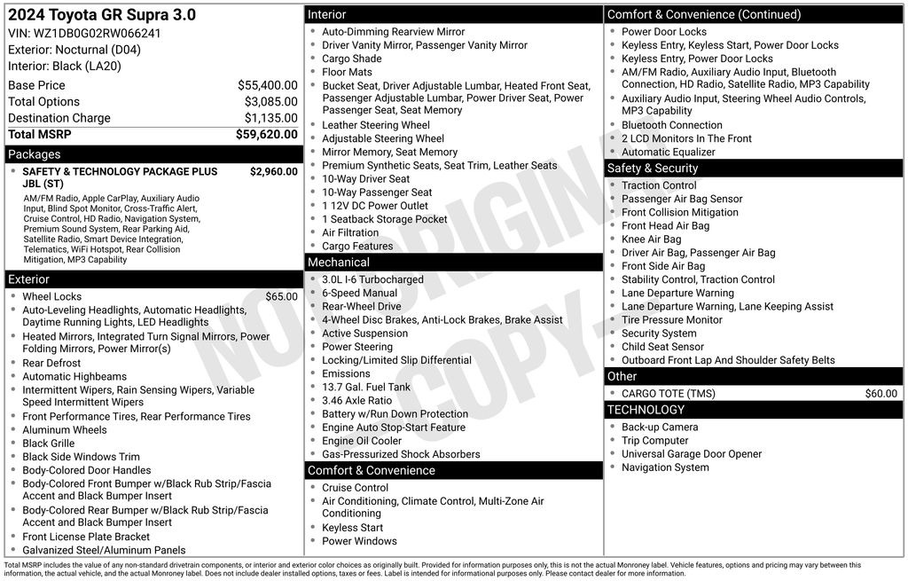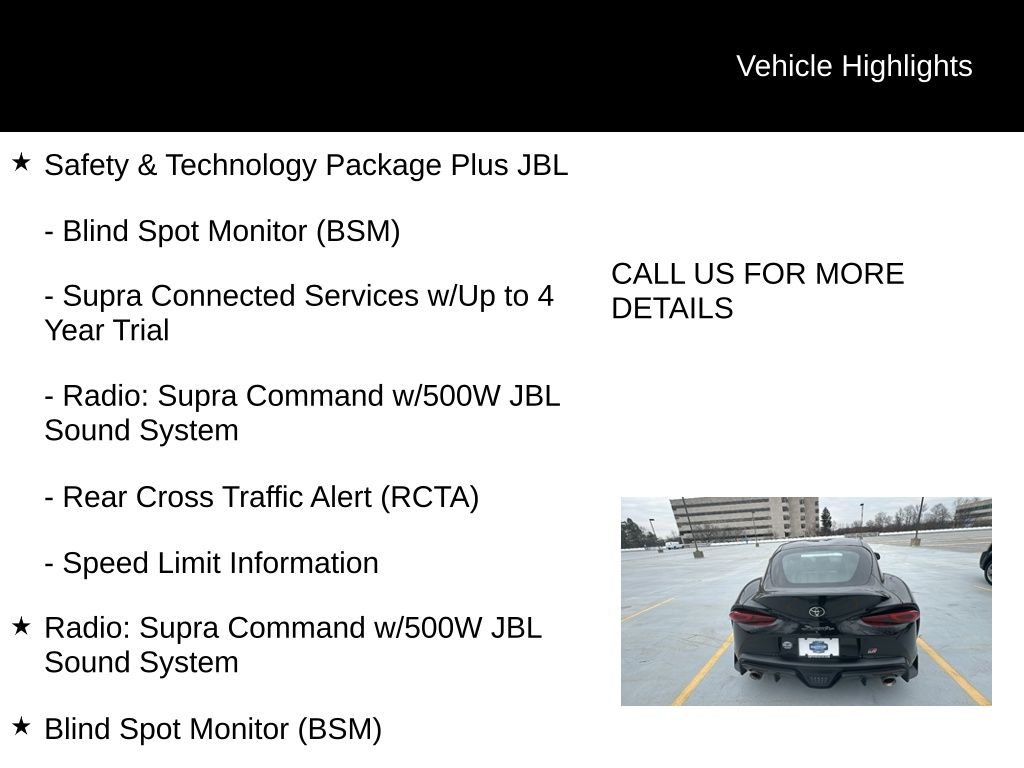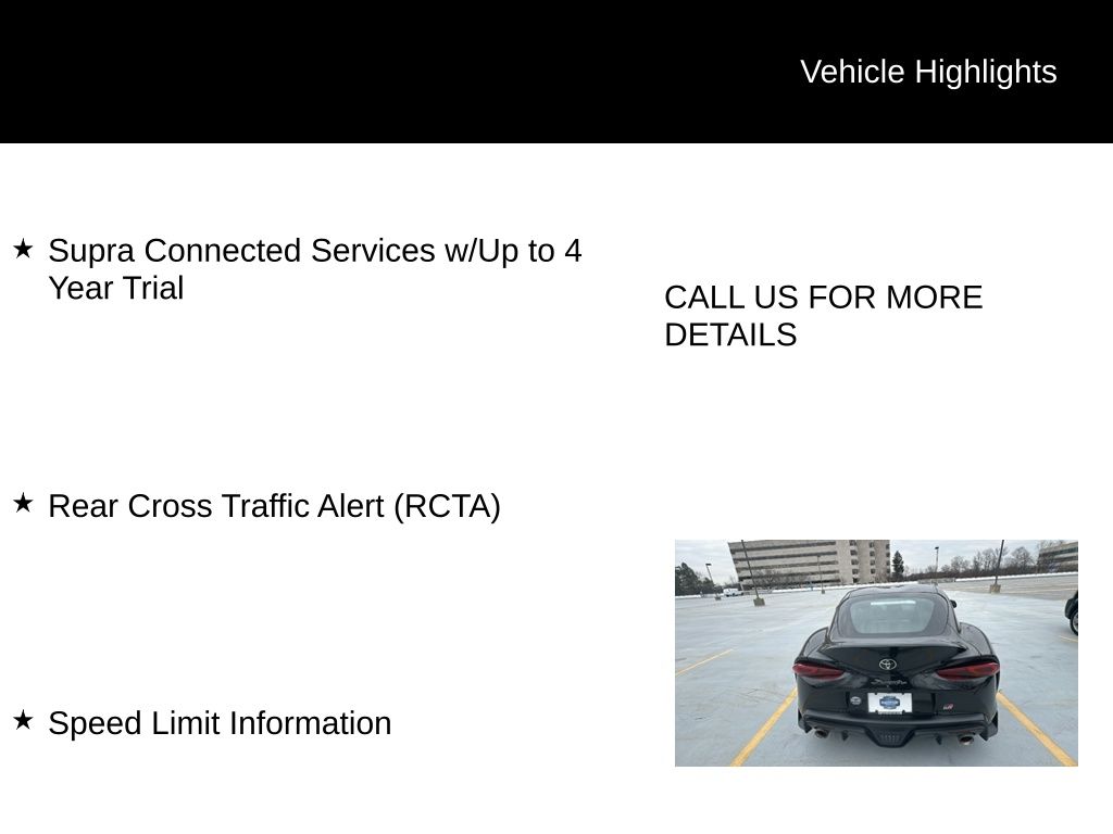 Equipped with a powerful 3.0L I6 DOHC 24V engine mated to a 6-Speed Manual transmission, the GR Supra delivers an adrenaline-fueled ride that will leave you craving more. Complementing its impressive performance capabilities are a host of premium features: